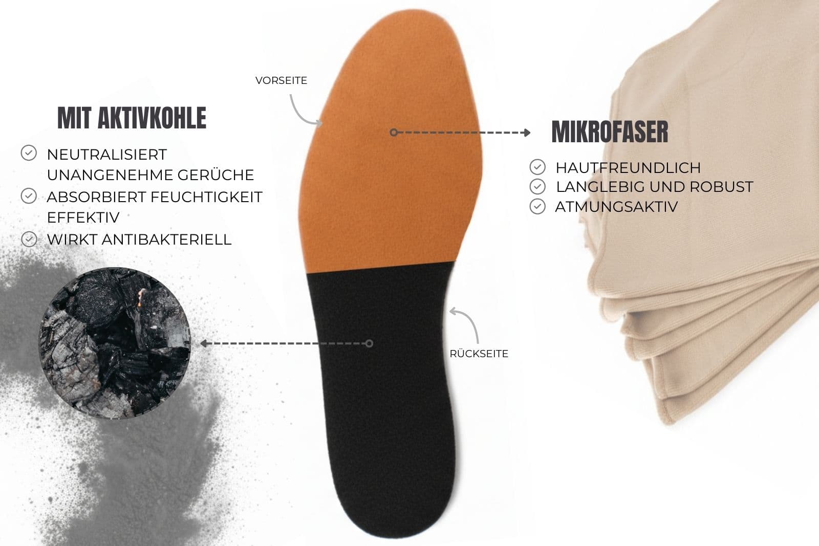Die integrierte Aktivkohle-Schicht absorbiert zuverlässig unangenehme Gerüche und wirkt antibakteriell, sodass Deine Schuhe den ganzen Tag frisch bleiben. Die atmungsaktive Struktur fördert zusätzlich ein angenehmes Fußklima und verhindert Feuchtigkeitsbildung.