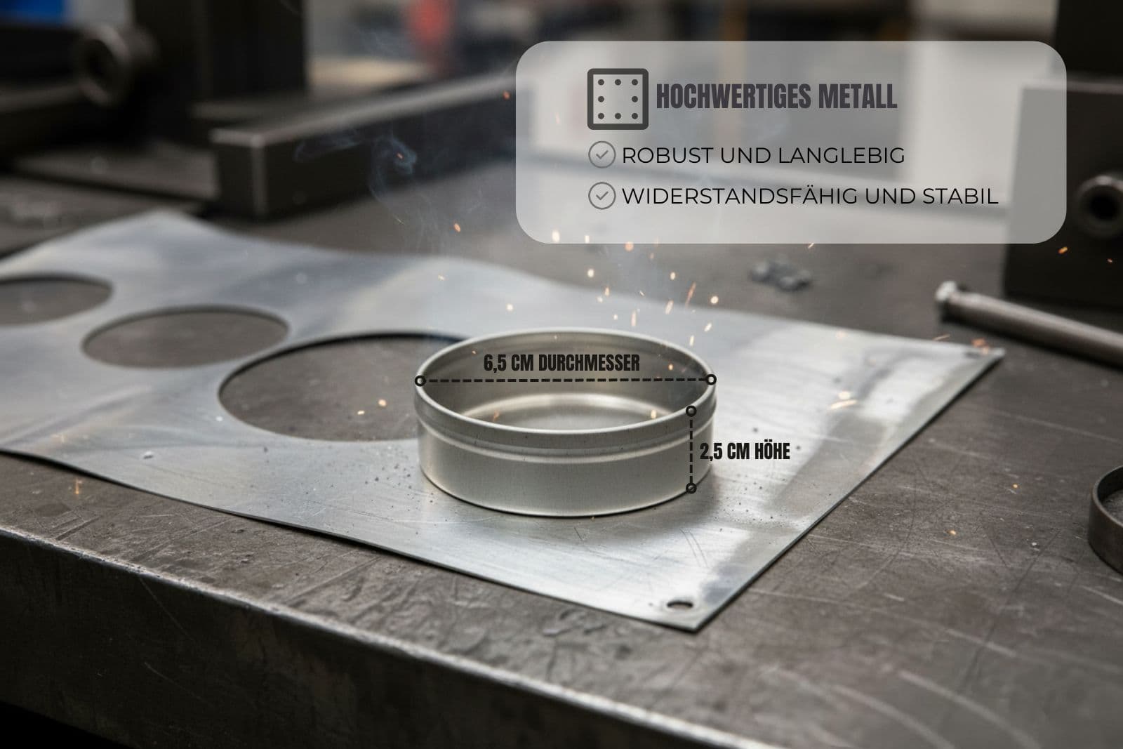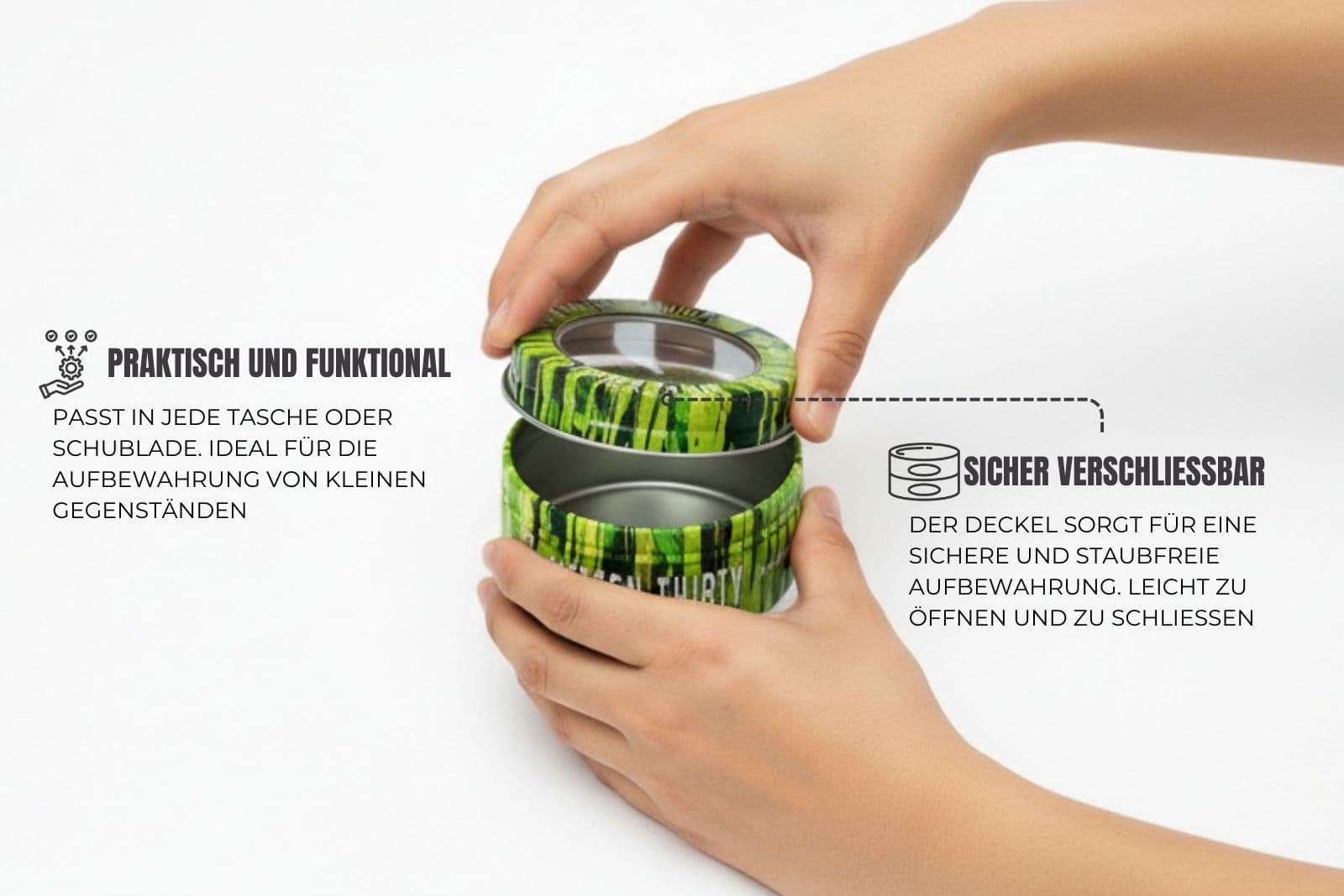 Mit einem Durchmesser von 6,5 cm ist diese kleine Metalldose ideal geeignet, um ein Paar Schnürsenkel aufzubewahren, deinen Raum ordentlich zu halten und deine Schnürsenkel stets bereit und in perfektem Zustand zu haben. Ihr Schraubverschluss gewährleistet einen sicheren Verschluss, während das transparente Kunststofffenster an der Oberseite einen Blick auf die farbenfrohen Schnürsenkel im Inneren gewährt, was Neugier und visuellen Genuss anregt.
