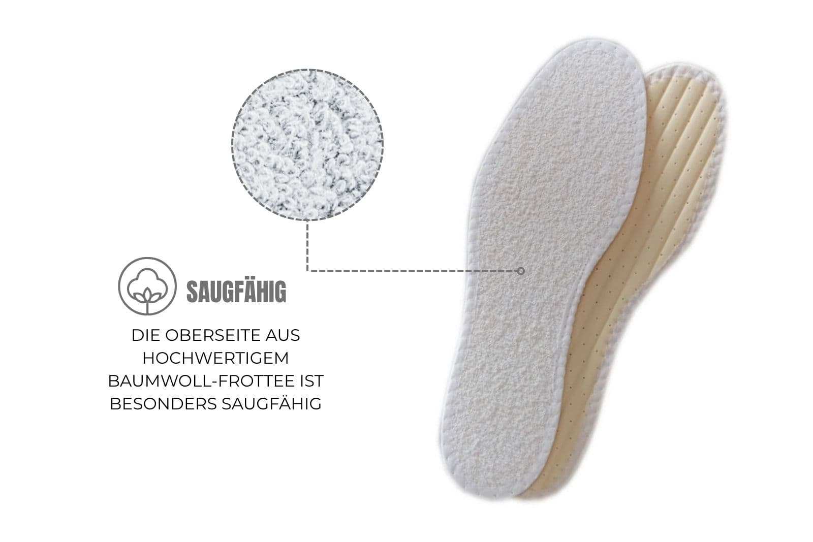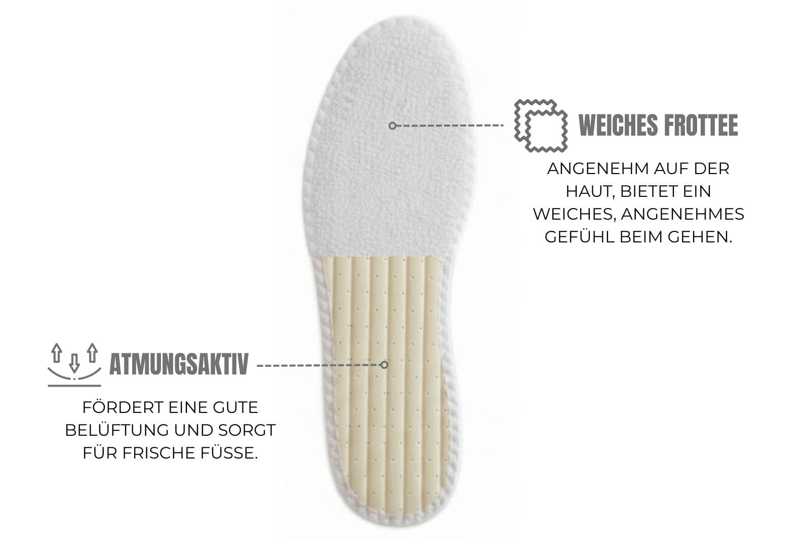 Erlebe ein freies Barfuß-Gefühl mit unserer Barfuß-Einlegesohle Baumwoll-Frottee. Die Oberseite aus hochwertigem Baumwoll-Frottee ist besonders saugfähig ideal für warme Tage, wenn Du gerne ohne Socken unterwegs bist und dennoch ein frisches Fußklima wünschst.