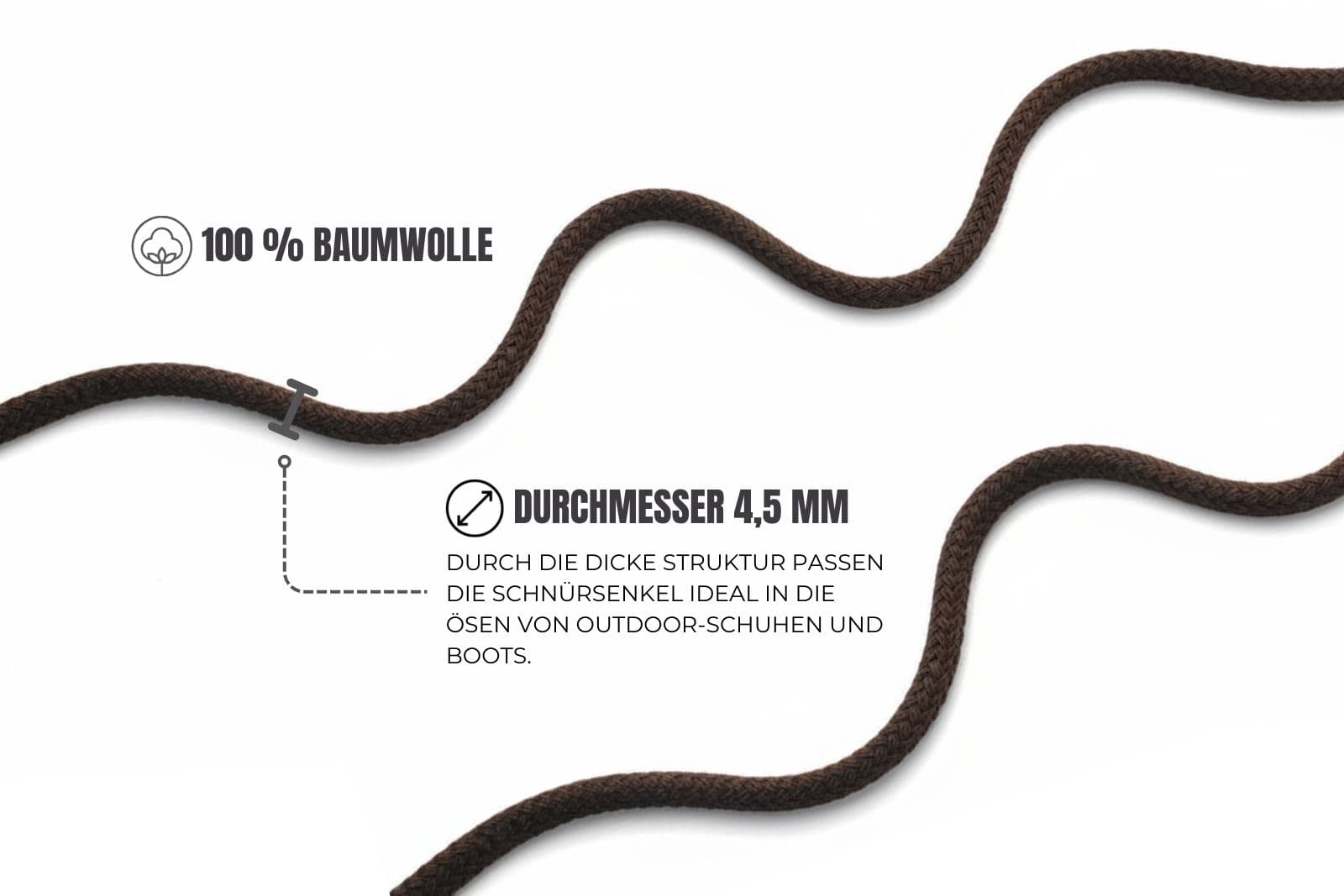 Erlebe mit dem Rund Extra Dick Schnürsenkel einen deutlich robusteren Halt und markanten Look für Deine Schuhe. Mit einem Durchmesser von 4,5 mm bietet dieser extra dicke Rundsenkel besondere Stabilität ideal für Boots, Outdoor-Schuhe oder Arbeitsschuhwerk.