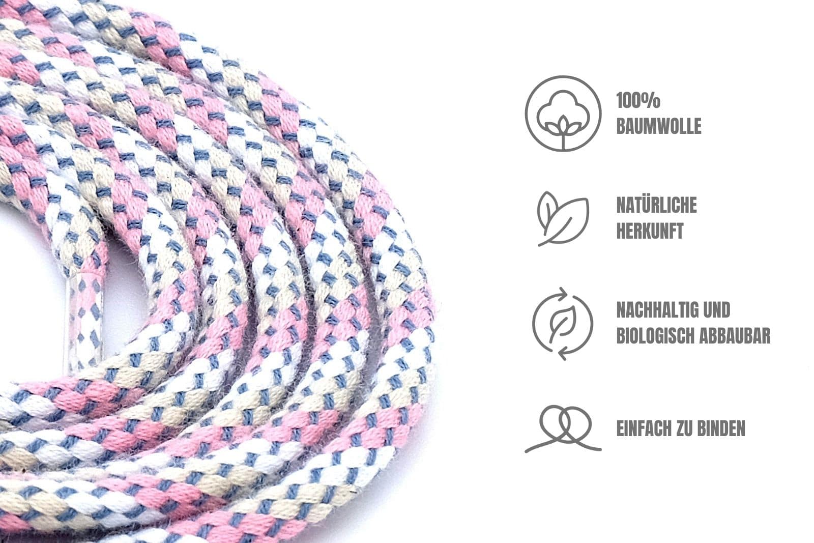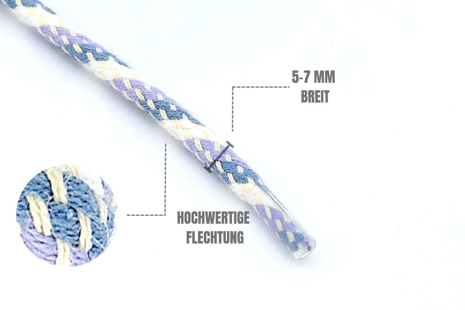 Unsere limitierten dünnen Rundsenkel aus Baumwolle sind für diejenigen gedacht, die dezente Eleganz und einen Hauch von Farbe schätzen. Diese 2,5 mm dicken Schnürsenkel, hergestellt aus 100% Baumwolle, bieten ein angenehmes und leichtes Tragegefühl und setzen einen feinen Akzent bei Freizeit- und eleganten Schuhen. Erhältlich in den lebendigen Farbkombinationen „Blau/Weiß/Rosa/Creme“ und „Gelb/Weiß/Blau/Violett“ verleihen sie deinem Outfit einen spielerischen und doch stilvollen Look.
