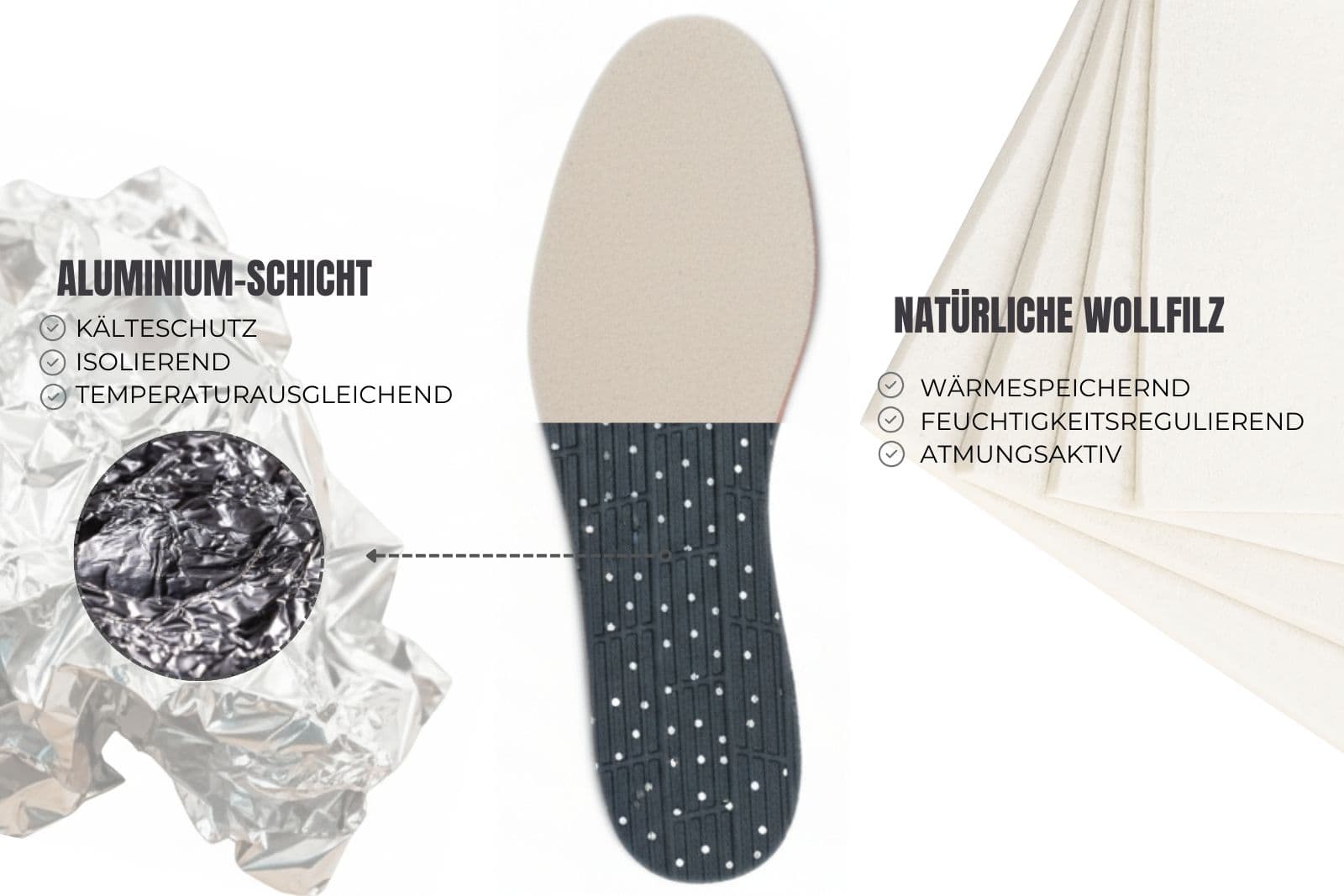 Dank der Aluminium-Schicht unterhalb schützt die Sohle effektiv vor Kälte von unten, während der natürliche Wollfilz in der Oberschicht Wärme spendet und gleichzeitig Feuchtigkeit ableitet, damit Dein Fuß trocken bleibt.