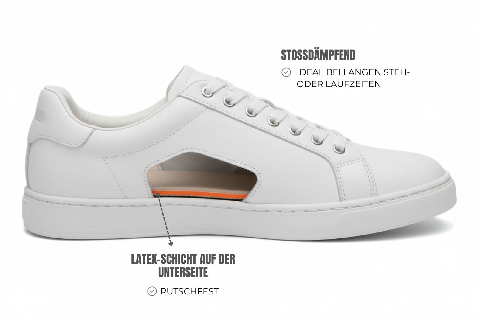 Die Sohle wirkt stoßdämpfend und ist angenehm weich ideal bei langen Gehzeiten oder harten Böden. Die Latex-Schicht auf der Unterseite sorgt dafür, dass sie nicht verrutscht.