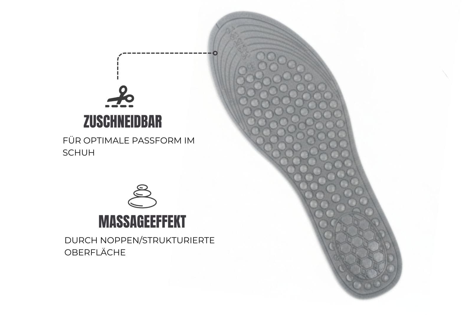 Die Sohle ist zuschneidbar, sodass sie perfekt in Deine Schuhe passt, und außerdem waschbar bei 30 °C – sauber zu halten und langlebig.
