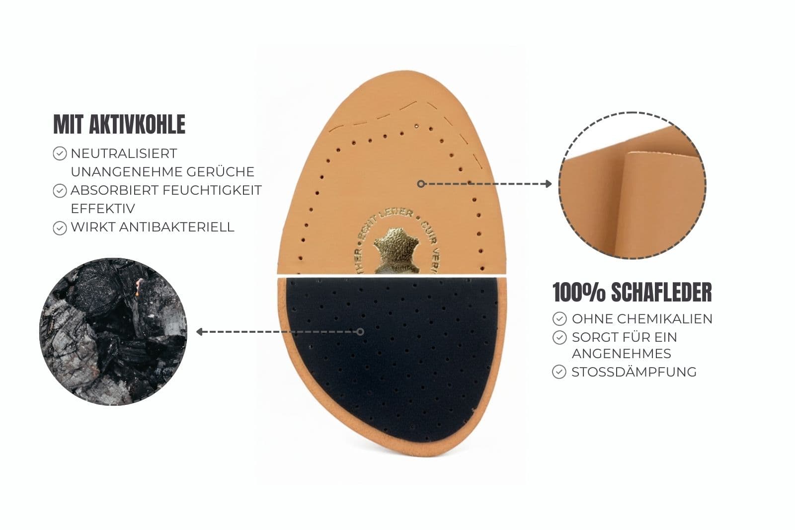 Gönn Deinen Schuhen und Füßen einen deutlichen Mehrwert mit der Leder Halbsohle mit Aktivkohle. Die Sohle besteht aus 100 % naturbelassenem, pflanzlich gegerbtem Schafleder, das sehr saugfähig und atmungsaktiv ist ideal für empfindliche Füße und warme Tage.