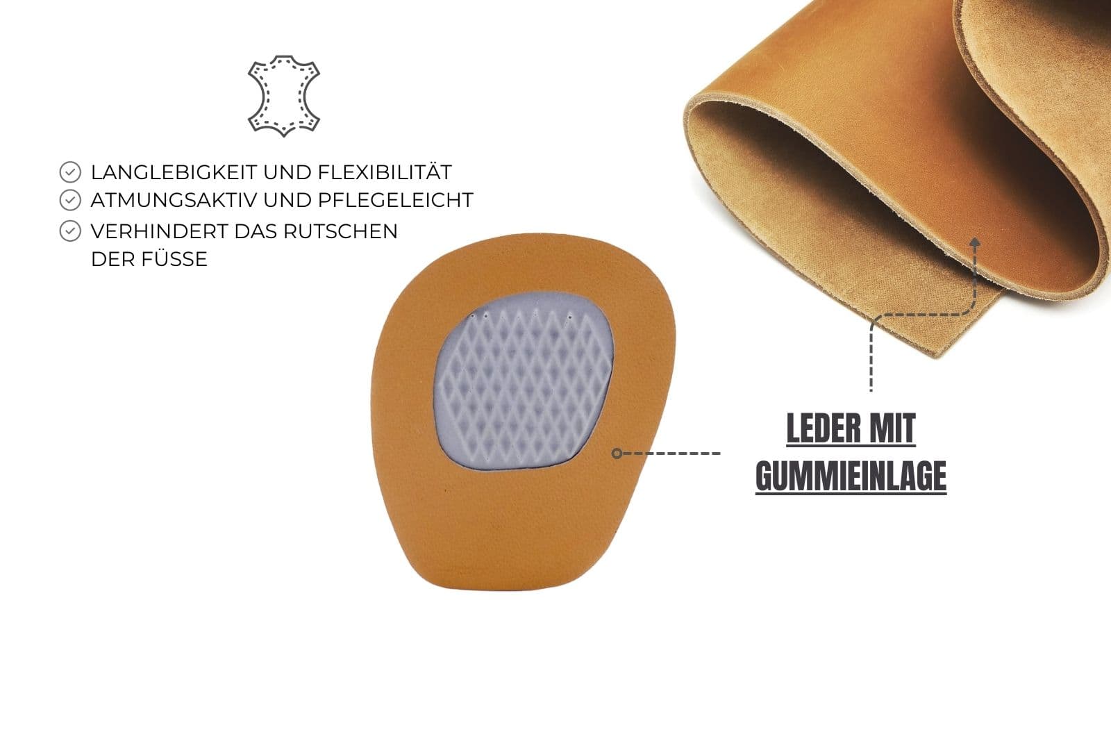 Gefertigt aus hochwertigem Leder, ist diese Rutschbremse weich und trotzdem strapazierfähig – ideal für lange Tragezeiten und für unterschiedliche Schuharten wie Sandalen, Pumps oder offene Schuhe.