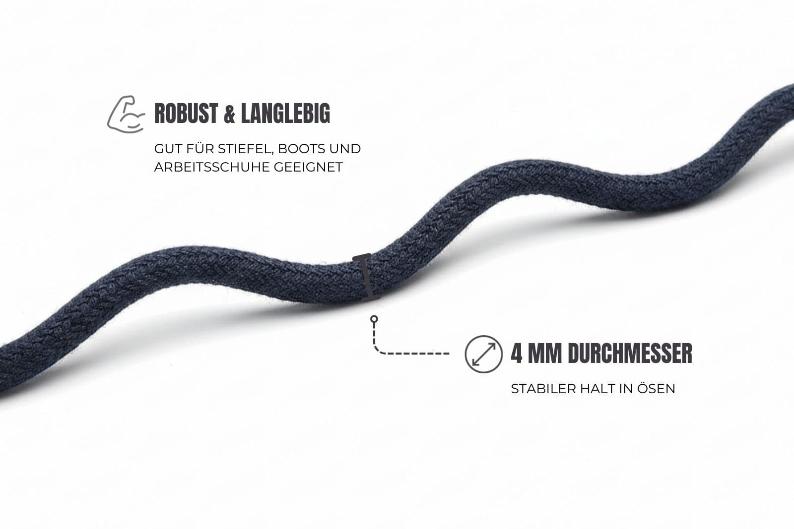 Mit verschiedenen Längen von 75 cm bis 200 cm passt dieser dicke Rundsenkel perfekt für Stiefel, Boots und Arbeitsschuhe. Seine stabile Verarbeitung sorgt für einen sicheren Sitz, auch bei anspruchsvollen Einsätzen im Outdoor- oder Arbeitsbereich.