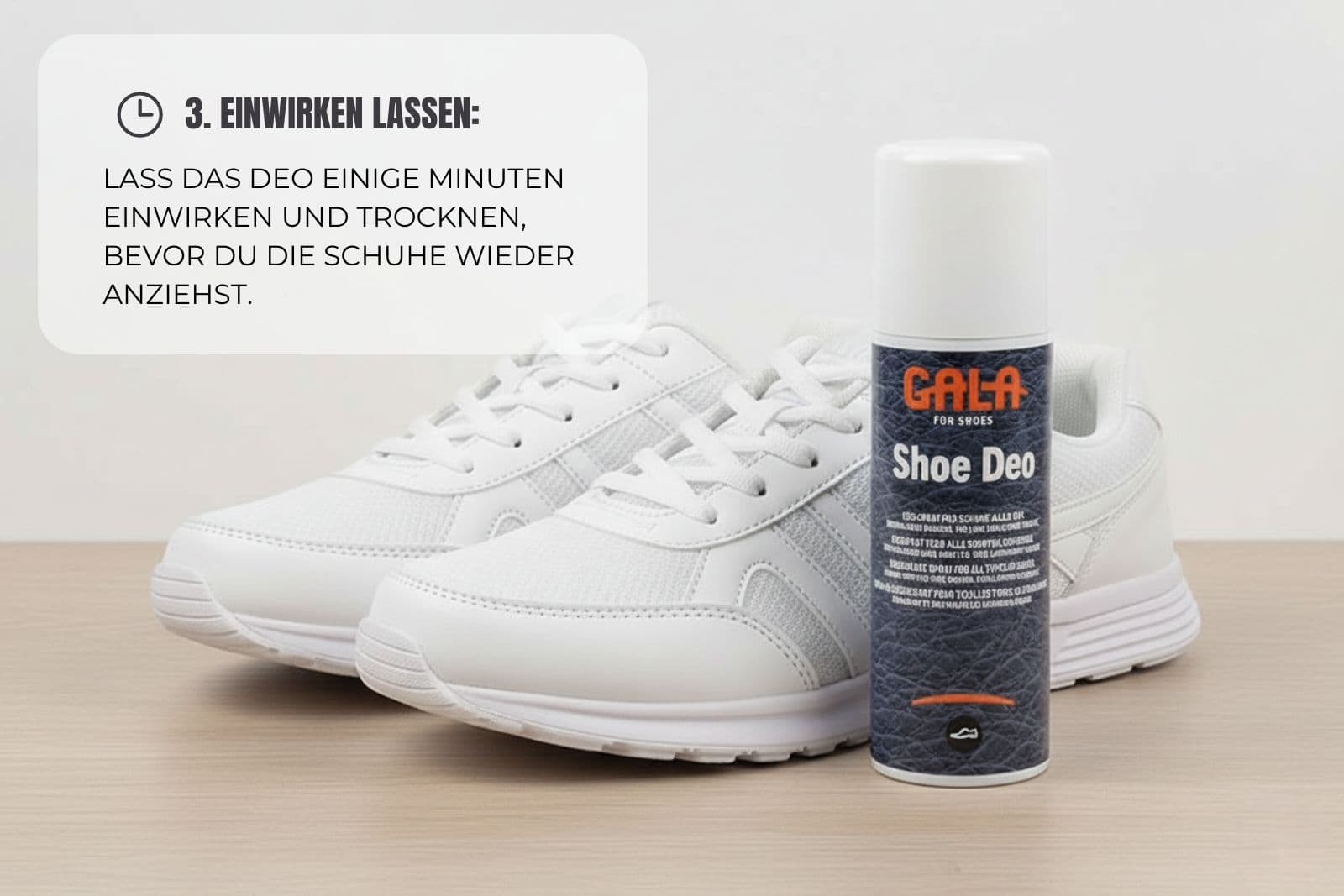 2. Sprühe je nach Bedarf kurz (Deo Spray für Schuhe) in den Innenraum besonders dort, wo Geruch entsteht.